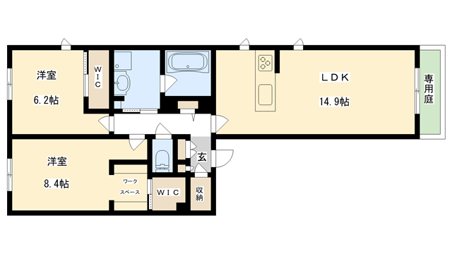 LDK14.9帖、洋室8.4帖、洋室6.2帖 |